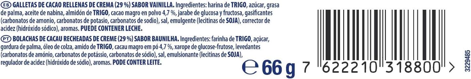 Harina de TRIGO, azúcar, grasa de palma, aceite de nabina, cacao magro en polvo 4,5%, almidón de TRIGO, jarabe de glucosa y fructosa, gasificantes (carbonatos de potasio, carbonatos de amonio, carbonatos de sodio), sal, emulgentes (lecitina de SOJA, lecitina de girasol), aroma. PUEDE CONTENER LECHE.