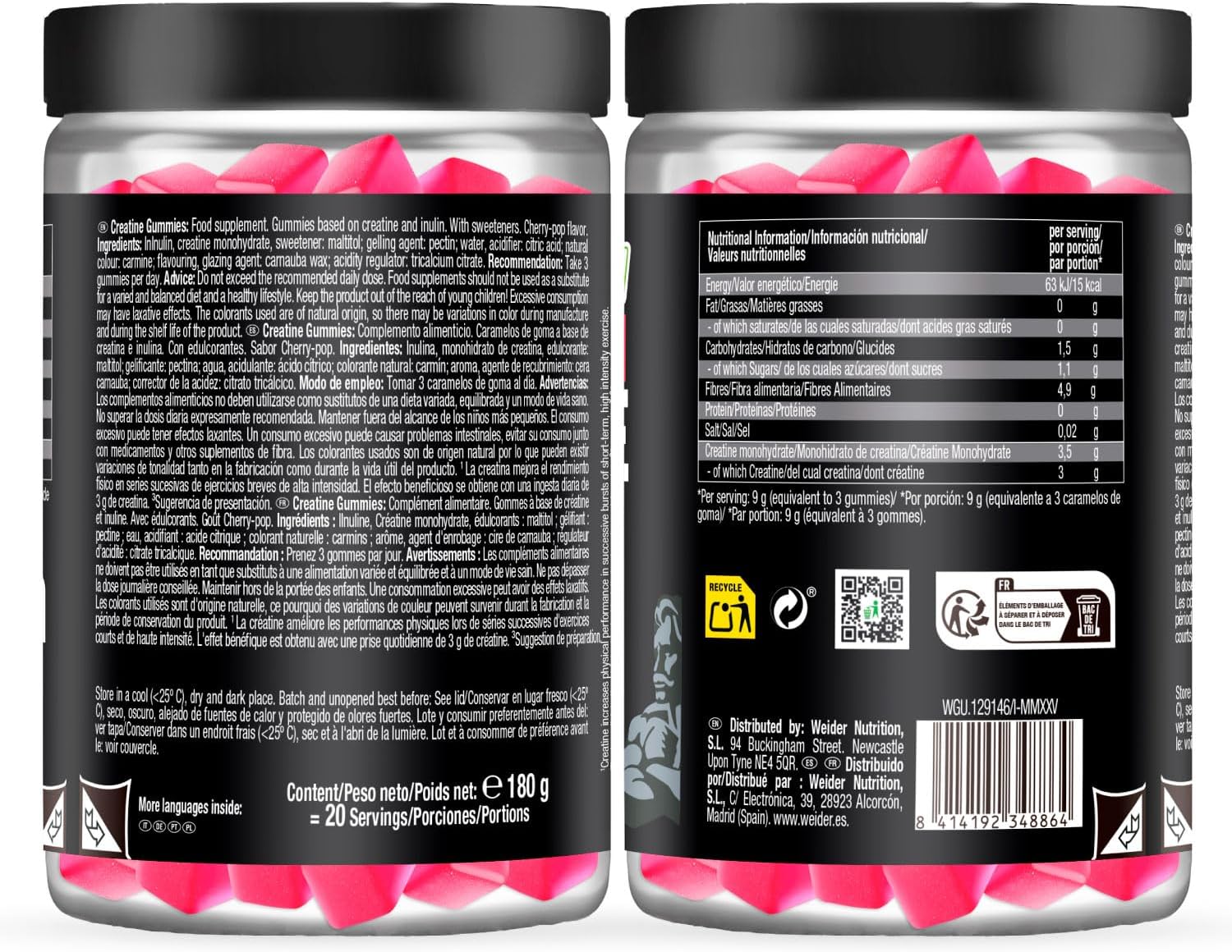 - CON CREATINA 100% CREAPURE: porque Weider se esforza en ofrecer lo mejor, la creatina elegida para sus Creatine Gummies son de la patente de calidad Creapure;