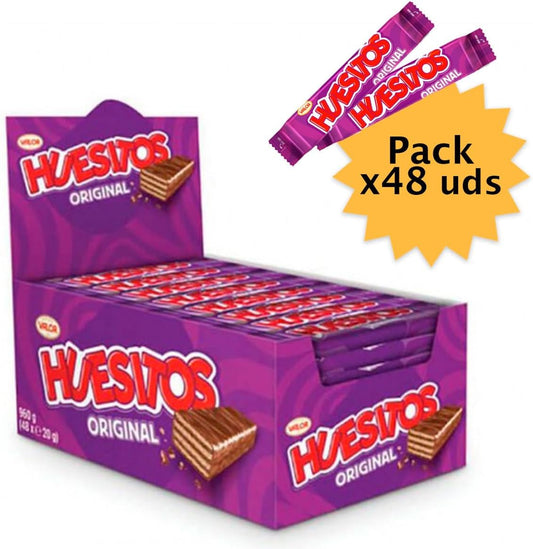 HUESITOS 48 UNDS. Barritas de galleta crujiente y ligera recubiertas de chocolate con leche Valor. Cada barrita pesa 20 gramos y va envuelta individualmente.
